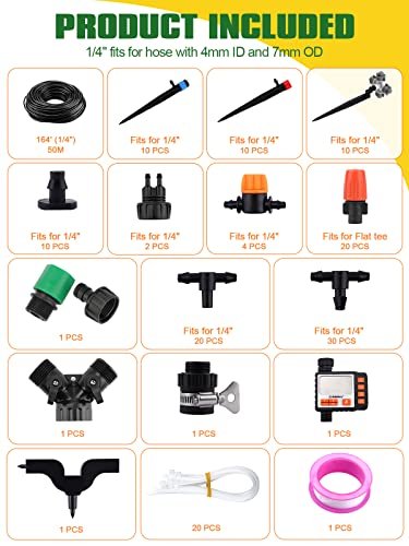 ✿【Garden Watering System】—Our garden irrigation set has 50M/164FT hose design irrigation tube and 131 PCS drip irrigation kit, 1 PCS timer, etc. Complete drip irrigation tools allow them to water at a larger plant area at a time!▲▲▲(Timer need 2✖ AA batteries (not included)