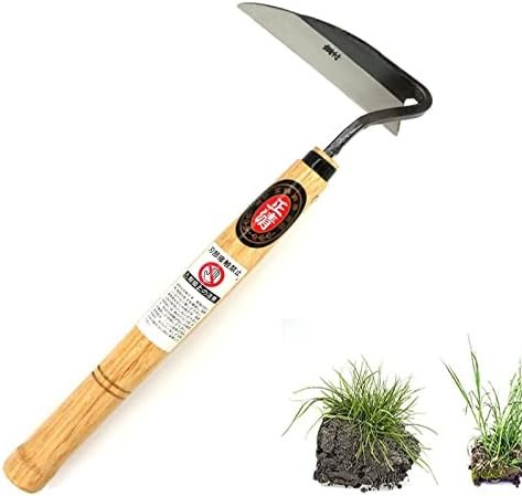 he forged high carbon steel blade of this Japanese weeder has a very sharp edge and will maintain it longer than most hand held weeders in the same price range.The forward weight and sharp edge of the blade helps to make quick work of most weeding tasks. Size:blade length is 5In, total length:13.71In. Material: Steel Production process: handmade Weight: 180g Package includes: 1 *garden hoe
