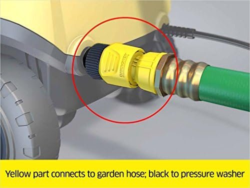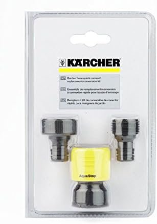 Three piece kit replaces the garden hose connectors for Kärcher electric pressure washers. The yellow piece attaches to your garden hose and the appropriate black piece to the water inlet on your pressure washer. The kit can also be used to convert standard threaded water inlets on Kärcher gas pressure washers to Quick Connect. The kit contains three pieces: a garden hose connector, a Karcher electric pressure washer connector and a standard threaded water inlet connector. Please note this kit can only be used on your pressure washers’s water inlet (where you attach the garden hose) – it can not be used on your pressure washer’s water outlet (where you attach the high pressure hose).