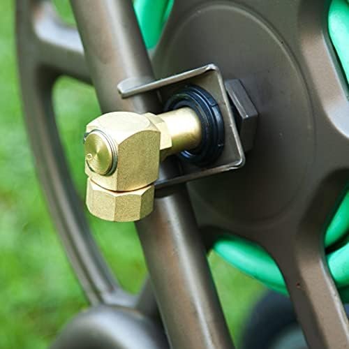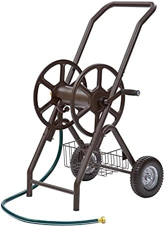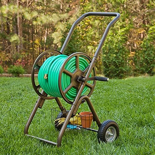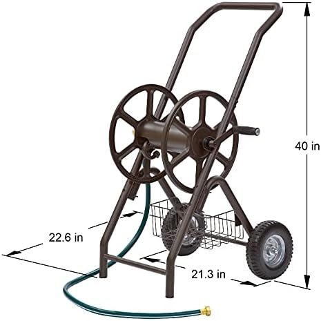 Features two 8.5-inch never flat tires, non-slip handle, 90 degree brass swivel connector, removable storage basket