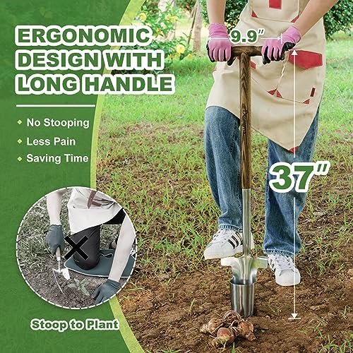 【Easy to Use Without Bending】Planting bulbs is back-breaking or painful on the knees using a regular planter. The 37” long handled bulb planter is able to stand and use it makes planting bulb a lot easier. You just step and twist makes a perfect depth hole for planting bulbs and bedding plants. (Works better in moist or damp soil, please water your soil and allow to soak to obain better results if you have a hard soil.)