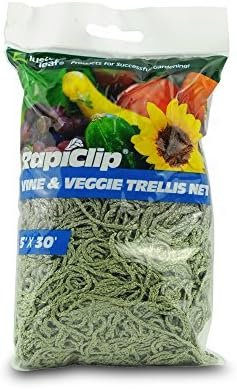 The Vine and Veggie Trellis from rapiclip is a soft material ideal for use with climbing plants of any kind. It’s unique, green color allows it to blend in with it’s surroundings. 5.25” squares allow for easy harvesting. It also has tie offs along both sides for easy tying onto stakes or supports. Available in 5’x10’, 5’x30’ and 5’x60’.