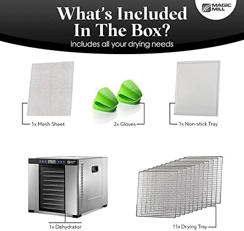 11 spacious, (15.5″ X 15.34″) Adjustable stainless-steel drying racks, 1 plastic fine mesh trays, 1 nonstick trays, 1 set oven mitts, to accommodate a wide variety of fruits, herbs, vegetables, and meats, great for large families, gardeners, sportsmen, outdoor hobbyists, health-conscious enthusiast