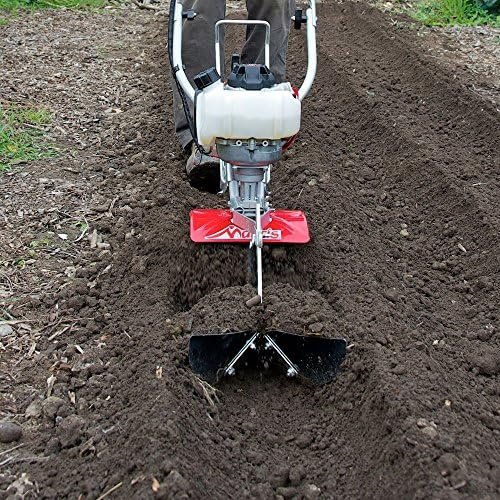 Propelled by the Mantis Tiller tines, loosening solid as you plow for perfect planting banks