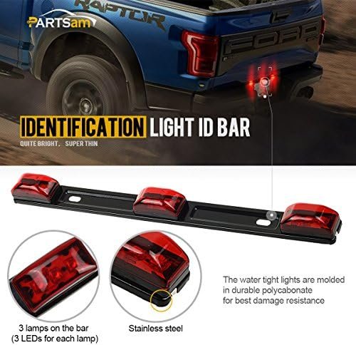 Partsam (1 x Red ) Waterproof truck trailer Identification Light Bar, long-lasting stainless steel black bracket base, stainless hardware included. three-light, 3-LEDs each marker light, totally 9LEDs, Red Lens Red LED Light; This Truck Trailer ID Light bar is great for trailer applications more than 80″ wide;