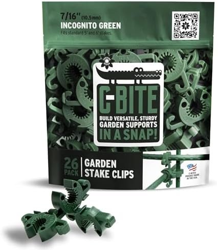 A SNAP TO USE: Reusable 1.75” wide plant clips interconnect and are quick and easy to attach to garden stakes, fences, and plant sticks, making your plant support a snap. Disassembles easily into a small bundle for off-season storage. 11mm C-BITEs fit best with 5’ and 6’ garden stakes. Made in the USA
