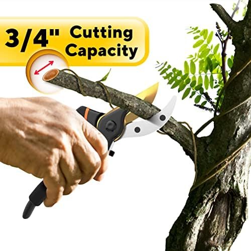 PRUNING SHEARS – Cuts Effortlessly. Equipped with high-quality SK5 carbon steel blades with superb sharpness and edge retention. These hand pruners can easily cut through stalks and branches up to 3/4″ in diameter.