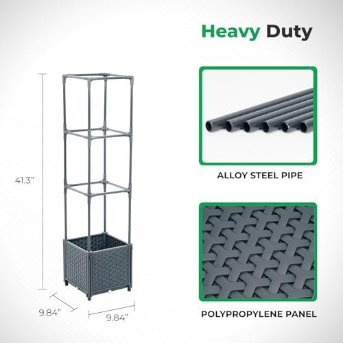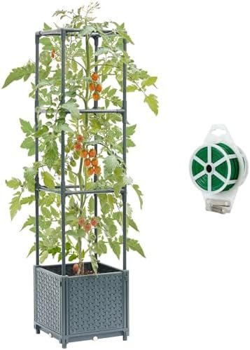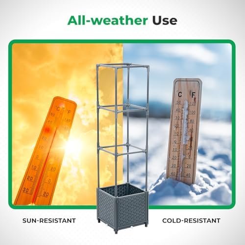 HIGH QUALITY & DURABILITY: This tomato planter box is made from fade-proof and reinforced PP material, featuring a sturdy alloy steel trellis frame for minimal maintenance. It excels in all-weather conditions, from scorching summers to frigid winters, making it a versatile choice for outdoor plant decoration.