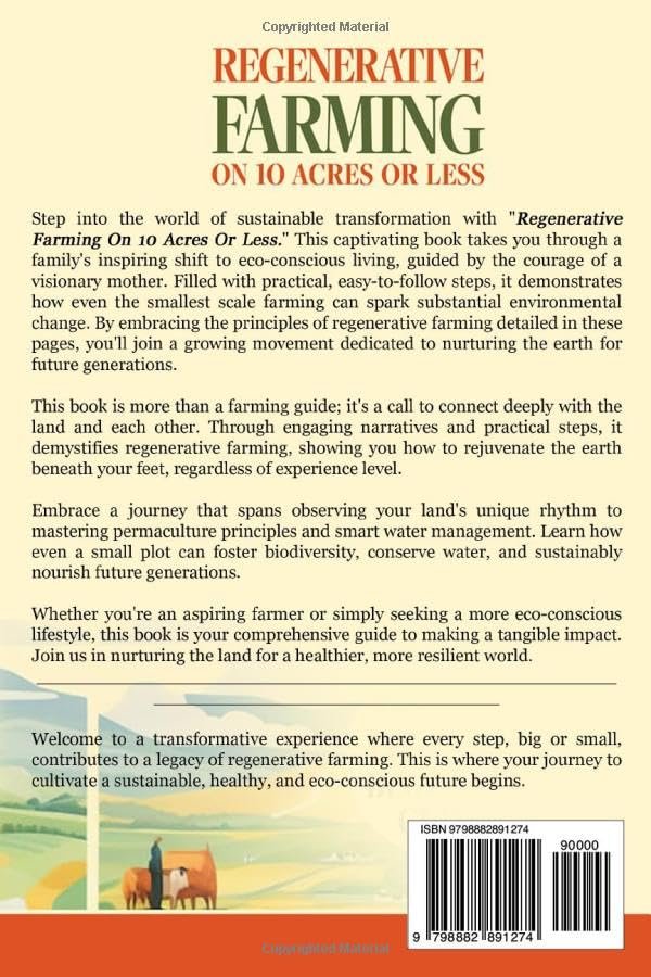 This captivating book takes you through a family’s inspiring shift to eco-conscious living, guided by the courage of a visionary mother. Filled with practical, easy-to-follow steps, it demonstrates how even the smallest scale farming can spark substantial environmental change. By embracing the principles of regenerative farming detailed in these pages, you’ll join a growing movement dedicated to nurturing the earth for future generations.This book is more than a farming guide; it’s a call to connect deeply with the land and each other. Through engaging narratives and practical steps, it demystifies regenerative farming, showing you how to rejuvenate the earth beneath your feet, regardless of experience level.