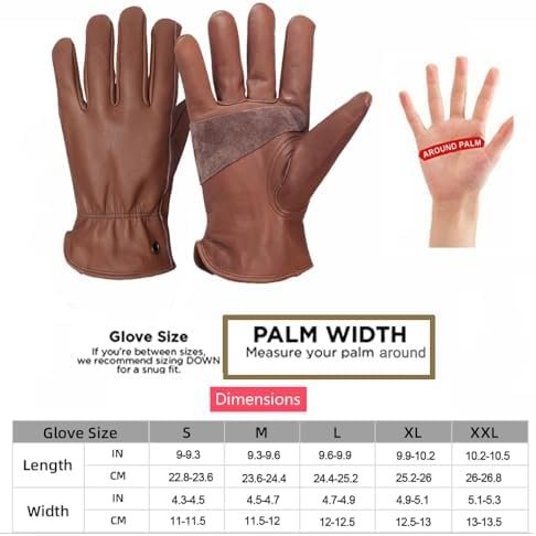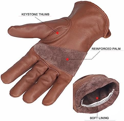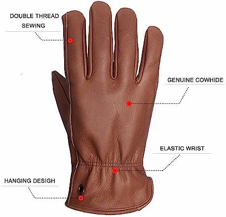 Top of the line colors:Retro Brown,Minimalism and cool!Genuine cowhide Leather:Made from carefully selected high-quality cow leather with thickness depth of 1.1- 1.2mmThick and Durable:Oil resistance,tear resistance and moderate stab-resistantQuality details : COPPER BUCKLE design for easy hanging and carrying around these glovesSize:Choose from M,L,XL for a perfect fit.