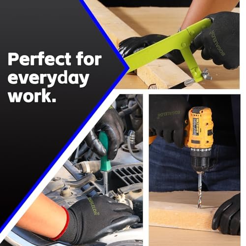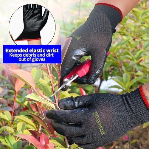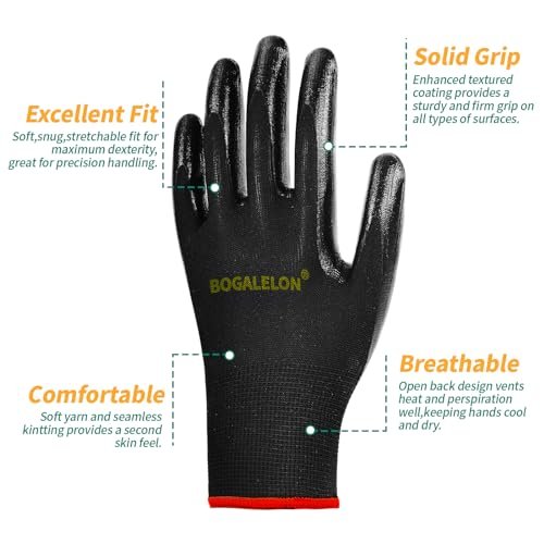 COMFORTABLE AND FLEXIBLE WORK GLOVES: The Bogalelon Work Gloves are lined with black seamless knitted nylon, a lightweight fabric with a breathable back of the hand, and an elongated wrist that effectively prevents debris and dirt from entering the gloves. The overall black design is more resistant to dirt.