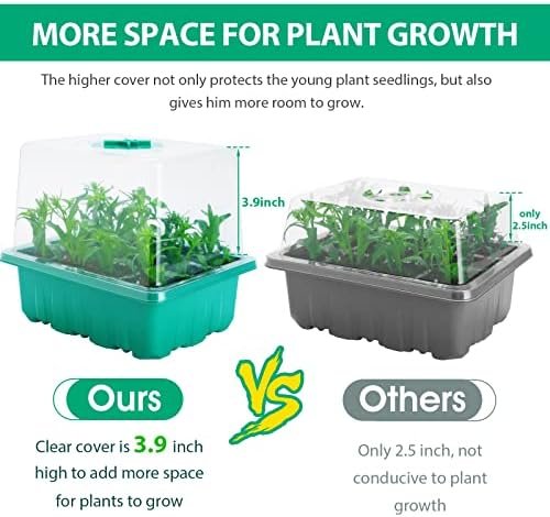 The seed starting trays are a convenient and compact way to grow flower, vegetable, and plant seedlingsSeed starter trays with grow lights can artificially control light quality, so that plants are always in the best growing environmentThe humidity dome height 3.9″, provides more space for the seedlings to growThe round drain holes of the seed trays can avoid the seed from absorbing too much water to rotten rootThe transparent propagator allows observing the seedling root growth anytimeThe bottom structure design is also available for putting the peatAdjustable vents on top of the humidity dome is good for humidity control and airflow during plants’ growth process