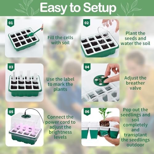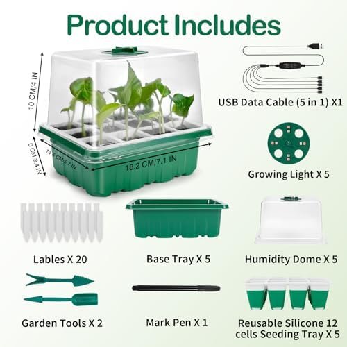 What You Get – The seed starter kit includes – 5 seed trays(12 Flexible Cells with Drain Hole per Tray), 5 adjustable humidity domes, 5 plants grow lights (8 LEDs each), 1 smart control system, 20 plant tags, 2 plant tools, 1 Pen. The seed starter tray with growth light is perfect for multiple types of seeds, seed germination, seedling starting, succulent cuttings, or other plant clone propagation.