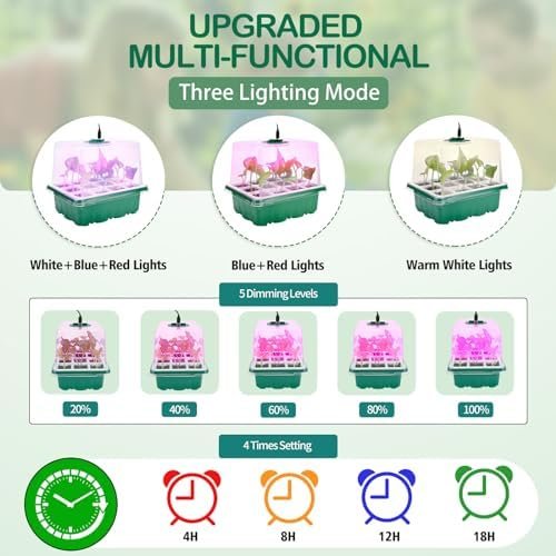 Upgraded Seed Starter Trays with Grow Lights – Upgraded Ecological Control System featured an adjustable light control system. Three modes of light (Red + Blue + Warm White / Red + Blue / Warm White) and five levels of brightness adjustment (20%/40%/60%/80%/100%) are suitable for various plants at all stages of growth. It also comes with a four-step timer function (4h/8h/12h/16h), so you don’t have to worry about the growth of your plants when you are out of the house. This LED plant light provides a full spectrum of light, just like natural sunlight, significantly enhancing indoor plant growth by accelerating photosynthesis. Suitable for all stages of growth and a wide variety of plants.