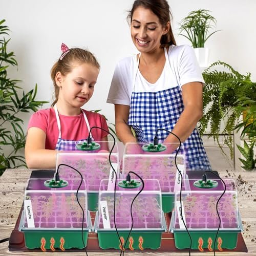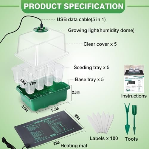 SEED STARTING KIT: Includes 5 pieces of 12-cell seedling trays, 5 base trays, 5 transparent covers, 5 humidity domes & growing lights, 1 power cord with 5 USB plugs (4.9ft long), 1 seedling heat mat, 1 pair of tools, 100 plant labels and 1 instruction manual. It caters to both experienced gardeners and beginners.