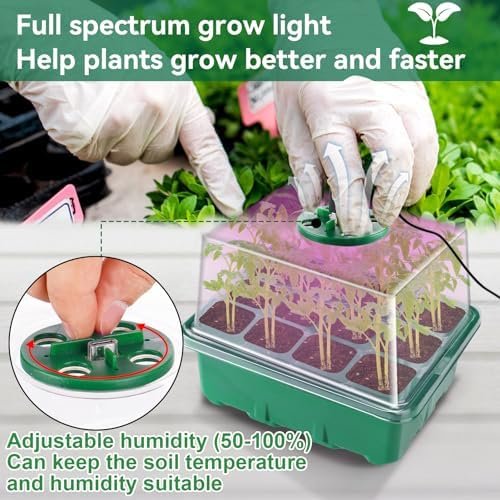 CONTROLLABLE HUMIDITY & FULL SPECTRUM GROWLIGHT: The clear cover features 4 vents, and the controllable internal humidity ranges from 50%-100%, you can adjust it based on different growth stages, promoting air circulation. The full-spectrum grow light can be adjusted for light quality, intensity, and photoperiod, maintaining an optimal growing environment and accelerating seed growth.