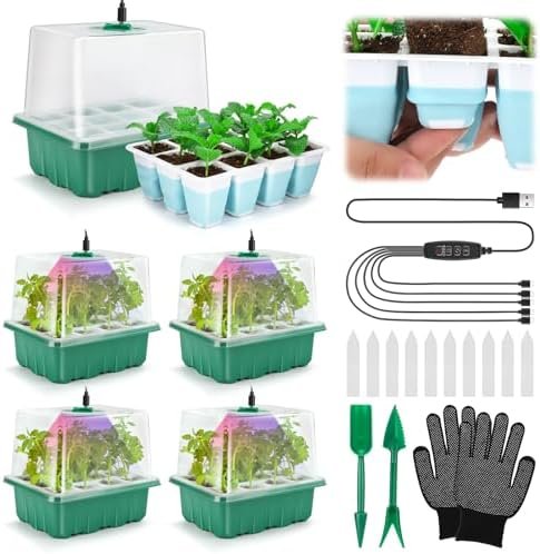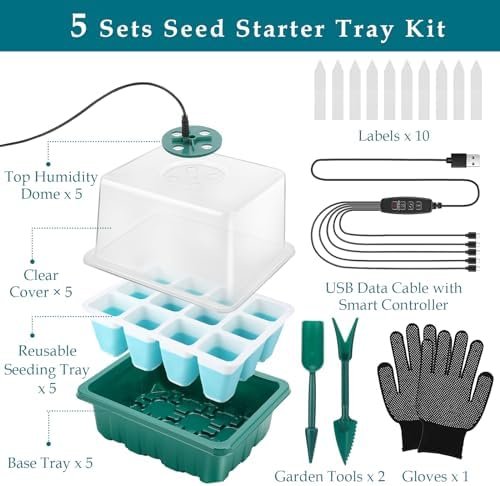 【Package Included】- Our seed starter tray comes with everything you needed, the package includes 5 PCS seed trays (USB Smart Controller, 12 cells Seeding Tray x 5, Base Tray x 5, Humidity Dome x 5, Clear Cover x 5, Plant Labels x 10, Garden Tools x 2, Gloves x 1). The complete seed starting kit is a perfect choice for you to standardize the operation and emerge neatly seedlings, providing a simple and convenient way for your seedling work.