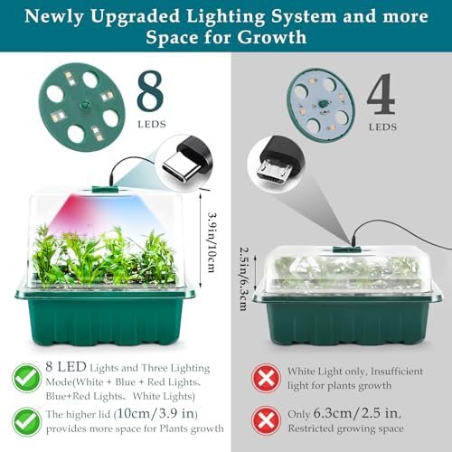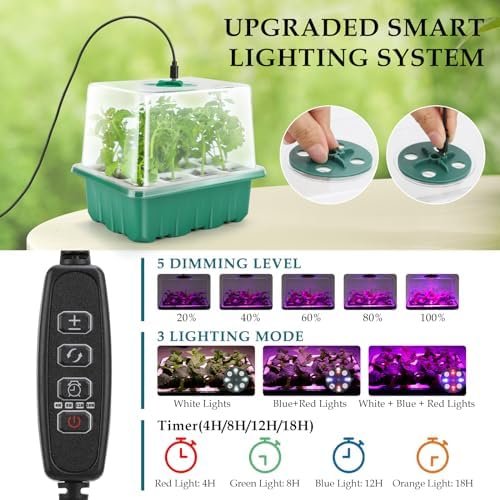 【Full-Spectrum & Smart Lighting System】- Our seed starter kit is upgraded to 8 LED per dome, with 3 lighting modes including red, blue and white light, Simulating the full spectrum of sunlight to promote photosynthesis and provide the best environment for seed germination. With 5 dimmable levels of light control and 4H/8H/12H/18H timer, you can easily adjust light brightness and illumination time to meet the lighting requirements of each plant at different stages.