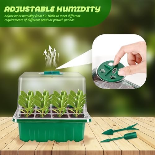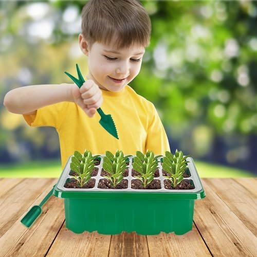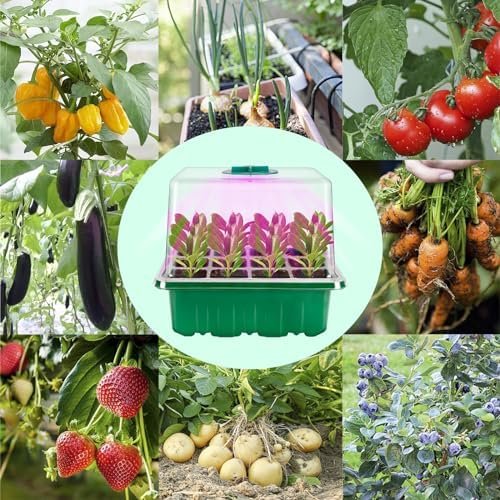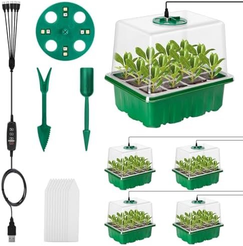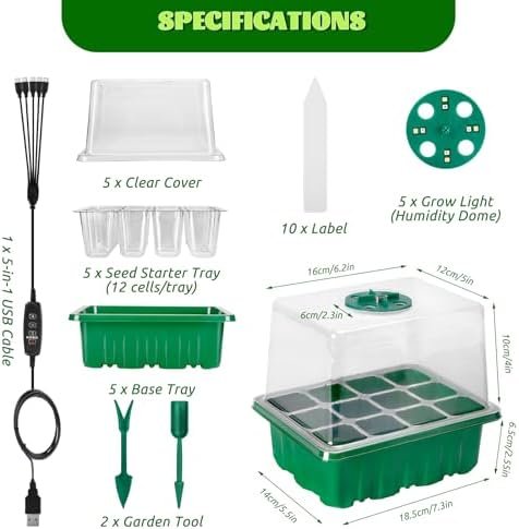 Clearly Observe the Progress of Seed Growth: Clear plastic trays of this seeding kit make it easy to check and monitor as you germinate your seeds. The drain hole at the bottom of the cell, allows excess water to drain and avoid oversaturating roots. Each cell on seed sprouting trays has enough space for your seedlings to develop a strong root system before transplanting to your garden. Package Includes: Seed Trays x5, Base Trays x5, Clear Domes x5, Circular Vents with Grow Lights x5, Plant Labels x10,Garden Tools x1, 5 in 1 USB Cable x1.