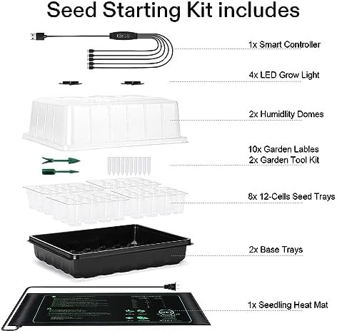 Value Package: A complete seed starter kit includes – 1 x Heat Mat, 8 x Seed Trays (12 Cells per Tray), 2 x Humidity Dome, 4 x Plant Grow Lights, 1 x Smart control system, 2 x Watertight Base Trays, Plant Labels and Tools. Perfect for seed starting, seed germination, seedling starting, succulent cuttings or other plant clone propagation, the seedling heat mats and grow light are energy efficient and designed to last for multiple growing seasons.