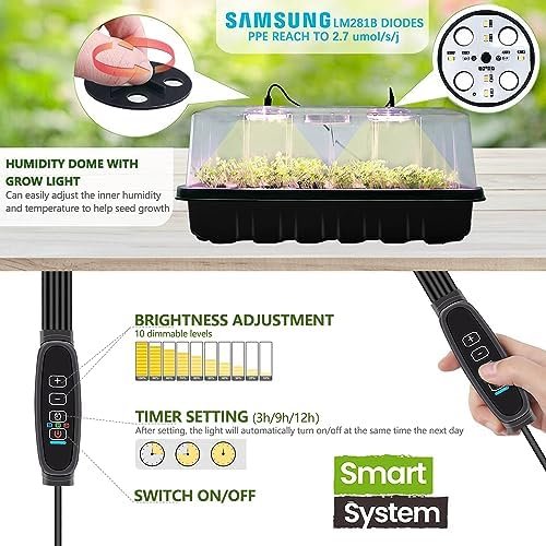 Upgraded Version: Our seed starter kit’s LED growing light was upgraded to use 8pcs SAMSUNG LM281B LEDs, PPE reach to 2.7 umol/s/j, High PPFD, Ensuring increased yields. With a smart control system that has 10 Dimmable Levels to adjust light brightness to accommodate different stages of seed to seedling growth; The Timer function will replicate your plants’ growth as in a natural environment while it’s turned on. With the 24h-cycle function that simulates daily sunlight, you won’t have to worry about plant development during business trips or vacations.