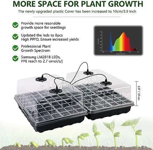 Seed starter trays with grow light that upgraded to 8 LEDs per light including 2 blue + 6 white LEDs, it’s like the full-spectrum sunlight that offers the best result for seed germination.Smart Control System with 10 Dimmable Levels to adjust light brightness.The plant light Timer will Auto On/Off every day at the time you select (3H/9H/12H) to replicate your plants’ growth in a natural environment while it’s turned on. With the 24h-cycle function that simulates daily sunlight, you won’t have to worry about plant development during business trips or vacations.