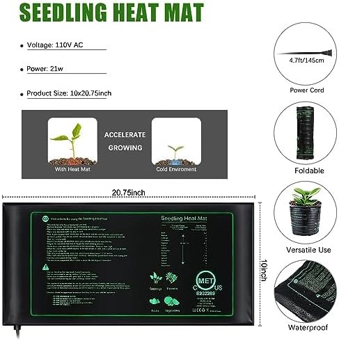 Heat Evenly To Root Zone: The seeding heat mat complies with MET standards, UL 499; Made with PVC material which is high temperature resistance, corrosion resistant, and Insulative; Silicone heating wire features fast heating, high thermal efficiency, and bendable. It warms soil to around 10℉-20℉ above ambient air temperature which provides the optimum environment for seed germination or cutting propagation. The IP65 waterproof surface is easy to clean.