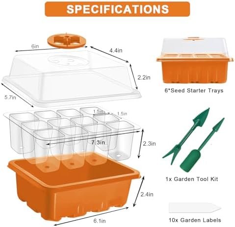 1). Seed Starter Trays – 6 pcs trays ,every tray size is 6.1” x 5.7” x 2.1” with 12-cell,they are made of pvc material, it allows you to carefully observe the trend of seeds growth.Its top cover humidity dome is also designed with a vent which allow for oxygen exchange and moisture retention, creating the optimum climatic conditions for your seeds.