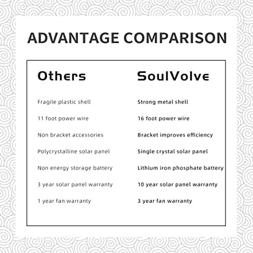 SOULVOLVE Solar exhaust fan provide the best solution to ensure continuous ventilation in outdoor rooms during the day. Use solar energy for power supply and avoid using 110V voltage. A safer way can be used to ventilate outdoors.Use sunlight to realize outdoor ventilation. Battery will provide a richer range of usage scenarios. When the sun is blocked by clouds, the non-battery version will stop working, while the battery version will continue to work.