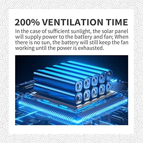 Solar Size 13.2*8.7*0.7 inch Solar Power Tolerance ±3% Battery Size 6*3.4*1.4 inch Battery Weight 0.8 pounds Battery Type Lithium iron phosphate Battery Waterproof Grade IP65 Battery Voltage 12V Battery Supply Energy 4~5 hours Fan Size 6 inch Fan Shell Metal Fan Blade PP Fan Noise 39dB Fan Type Exhaust fan Ventilated Space 400 cubic feet