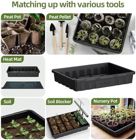 Versatility and Adaptability of Seed Trays Seedling Starter: Matching up with various tools like soil blocker, heat mat, seed tray dome, cell tray insert, nursery pot, peat pot, peat pellet, and soil directly. Perfect for seed starting, microgreens, hydroponic setups, young seedlings, and sprout growth. They’re suitable for indoor gardening, gardens, patios, greenhouses, and more.