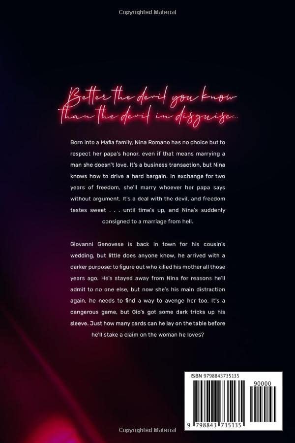 Born into a Mafia family, Nina Romano has no choice but to respect her papa’s honor, even if that means marrying a man she doesn’t love. It’s a business transaction, but Nina knows how to drive a hard bargain. In exchange for two years of freedom, she’ll marry whoever her papa says without argument. It’s a deal with the devil, and freedom tastes sweet . . . until time’s up, and Nina’s suddenly consigned to a marriage from hell.