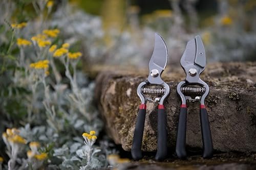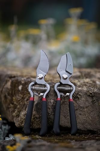 The Spear & Jackson Traditional Pruners Set is ideal for both serious and amateur gardeners alike. The bypass pruners utilise a scissor like cutting action which is best suited to use on living or ‘green’ stems and delivers a cleaner cut than the anvil style pruners which use a knife like cutting action onto the flat anvil. Anvil pruners are ideal for use on thicker, or dead ‘woody’ material, but will crush or distort the cut when used on green stems.