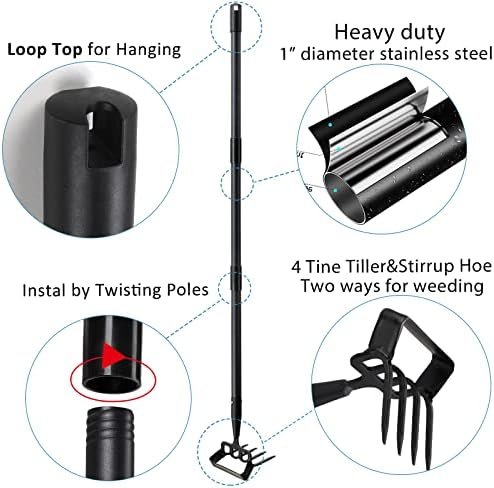 Stirrup hoe carbon steel blade head with sharp end makes garden hoe easier to either scrape the top layer of dirt to get the weeds cut or get this tool under the surface of the soil to rip them out.