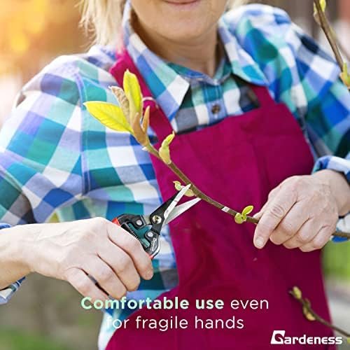 ✅【PRACTICAL AND EFFORTLESS DESIGN】: Gardeness garden pruning shears are meticulously crafted for practicality and user-friendliness. The lower serrated blade securely grips stems, allowing effortless, clean cuts. The ergonomic handle guarantees comfortable use, turning harvesting into a breeze. Over time, blade stickiness due to tree sap can hinder proper opening and closing, but adjusting blade tension is a breeze with a simple screwdriver.