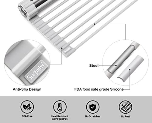 Surpahs Over Sink Foldable Multipurpose Roll-Up Dish Drying Rack, Silicone Wrapped Stainless Steel, Warm Gray, 20.5″ x 13.1″