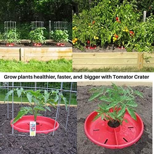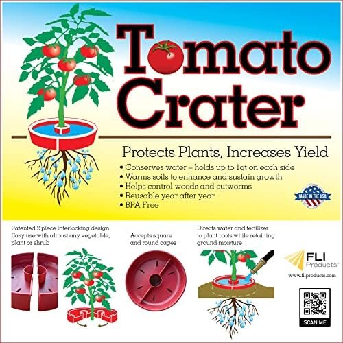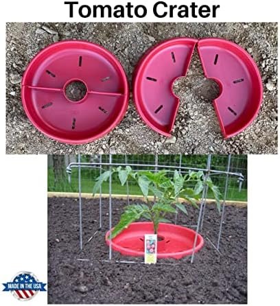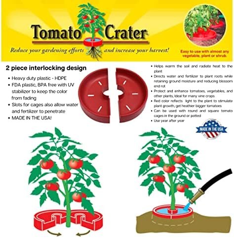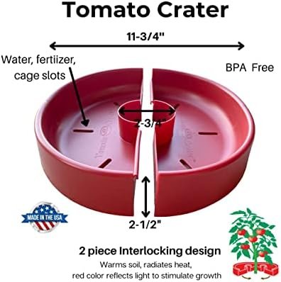 Tomato Crater directs water and fertilizer to plant roots while retaining and warming ground moisture, reducing blossom end rot, naturally protects against cutworms and weed creeping, enhances growth Two interlocking halves snap together around the plant to form a water/fertilizer trough while warming the soil and enhancing growth. The molded slots allow use of square or round tomato cages. The the heavy-duty BPA free plastic with UV stabilizer allows use year after year. It’s called the Tomato Crater but you can increase your harvest of cauliflower, cabbage, broccoli, zucchini, squash, and cucumbers too using the Tomato Crater. Whether you’re an expert gardener or a novice, everyone enjoys the satisfaction and flavor from planted garden vegetables. 12” Red