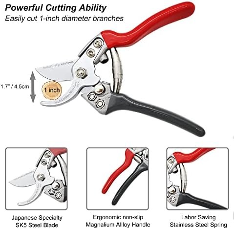 [ POWERFUL CUTTING ABILITY ] – The garden pruning shears are made of Japanese stainless steel (SK5 steel) which can easily trim branches with a diameter of 1 inch, heavy-duty and sharp.