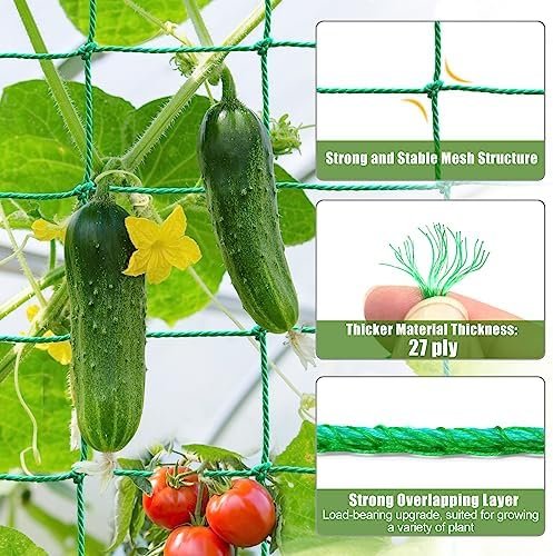 ✅ HEAVY DUTY PLANT NETTING, UPGRADED LOAD-BEARING – The garden cucumber trellis netting is woven with 27 strands of high-quality nylon threads (not 18 strands), with an overlapping layer edge structure, the garden trellis for vegetables can support extremely heavy crop loads.