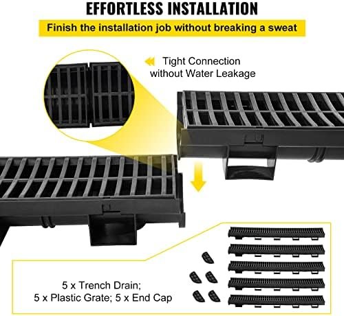 Complete Packing List: This trench drain kit comes with 5 drains with built-in bottom outlets, 5 plastic grates, and 5 end caps. Plus, the outlet connector is already built-in. All the accessories that you may need are included.