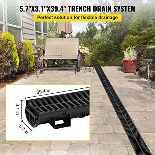 Low-profile Drain System: Dimensions of each channel: 5.7″ W x 3.1″ H x 39.4″ L. Commercial water drainage systems allow safe and efficient drainage for grassed areas, gardens, farms, patio areas, pool sides, office buildings, driveways, or factory interiors. The anti-flotation design prevents floating and doesn’t require staking when setting in concrete.