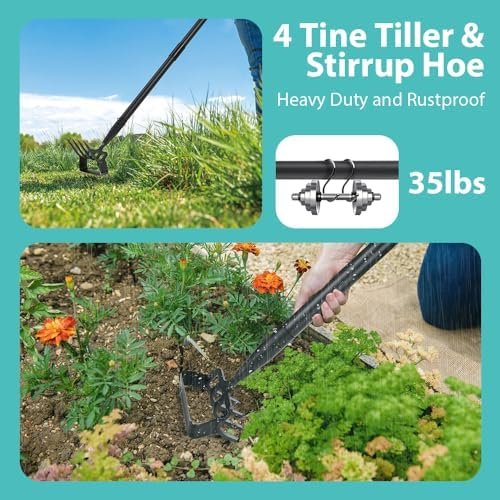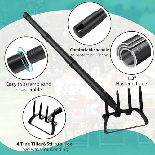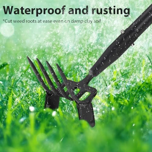Upgraded Gardening Tool: Combining the functionalities of a stirrup hoe and a cultivator, making gardening work faster and more effective.Hip and Knee Saver: The tool features an adjustable length, allowing easy reach to tough weeds without the need to bend over, sparing your back.Heavy-Duty Garden Tool: Constructed with 1.3-inch thick diameter steel, ensuring it won’t bend or break during intense gardening tasks.Versatile Stirrup Hoe and Cultivator: Ideal for chopping weeds, grass, picking up weeds, reaching roots, loosening soil, cultivating vegetables, ditching, and seeding.Multi-Area Usage: Suitable for various gardening areas including flower beds, vegetable gardens, backyards, beaches, raised beds, both wet and dry soils, and landscaping with rocks.