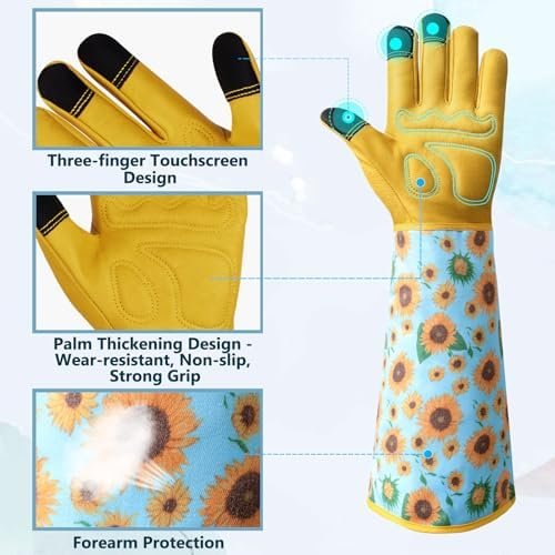 【Flexible and Breathable】Our working garden gloves are designed ergonomically to enhance thumb flexibility and sensitivity, making it easier to grip gardening tools. These long-cuffed gloves, made from cowhide and polyester-cotton, provide breathability, allowing year-round use.