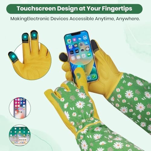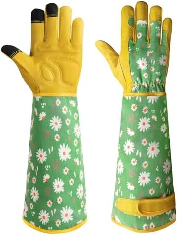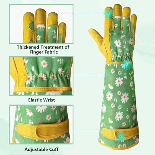 【Flexible and Breathable】Our working garden gloves are designed ergonomically to enhance thumb flexibility and sensitivity, making it easier to grip gardening tools. These long-cuffed gloves, made from cowhide and polyester-cotton, provide breathability, allowing year-round use.
