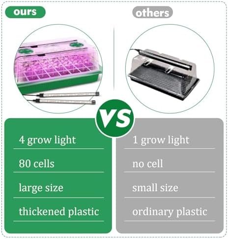 [Smart Control System ] Designed after professional evaluation, each plant light consists of 9 red light beads, 7 yellow light beads, and 4 white light beads. Our seeding starter tray comes with a multi-functional grow control light. 3 light modes, 5 brightness levels, 3 timing modes: Red light on the controller is 3 hours, blue light is 6 hours, and red & blue light is 12 hours. This light regulator allows you to customize different light intensities for different plant growth stages.