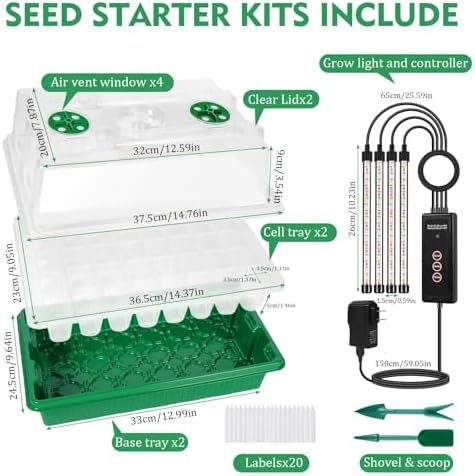 [Complete Seed Starter Kit] Each seed starter tray kit includes 2 sets of seed trays, 4*humidity domes with adjustable vents, 4*plant grow lights with smart control system, 20*labels, 2*garden tools. This seed germination kit can meet all your gardening needs. It can also promote harmonious family relationships, grow plants with your children, improve their observation skills, learn about the growing process of plants, and enjoy the joy of harvesting.