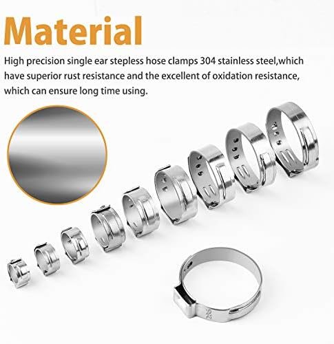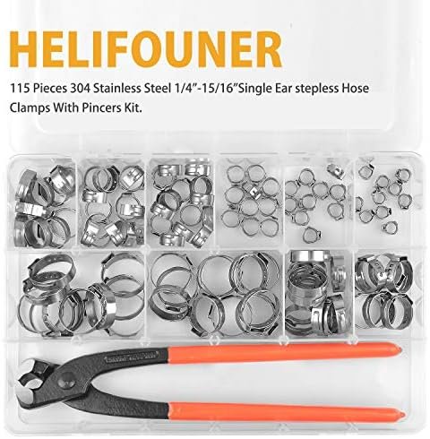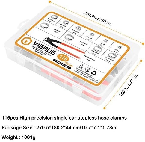 【Wider Hose Clamp Size】: This single ear hose clamp set covers inner diameter range of 6-28.6mm (10 common sizes): 6-7mm 10pcs, 7-8.7mm 10pcs, 8.8-10.5mm 15pcs, 10.3-12.8mm 15pcs, 12.8-15.3mm 15pcs, 15.3-18.5mm 10pcs, 17.8-21.0mm 10pcs, 20.3-23.5mm 10pcs, 22.4-25.6mm 10pcs, 25-28.6mm 10pcs total 115pcs packed in an organized durable plastic box, easy to storage and carry.