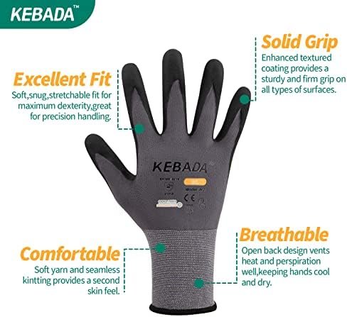 【Work Gloves with Grip】: Delicate designed Kebada womens work gloves with grip provide abrasion protection across palm and fingers, EN388 highest Level 4 abrasion rating. Foam Nitrile coating provides grip in dry, wet and light oily conditions, offer extra ability to hold objects firmly in hand, Great to be used as box handler gloves for warehouse workers. lightweight and breathable feature with super dexterity make then great gardening gloves for men, perfect for yard work and outdoor use.