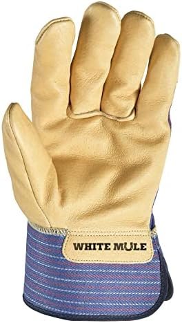 Grain pigskin leather palm with blue striped denim back and safety cuff. Features reinforced leather patch palm and finger & thumb tips, leather knuckle strap & heel, wing thumb, bond hem, shirred wrist. Color: Tan with blue striped denim back.