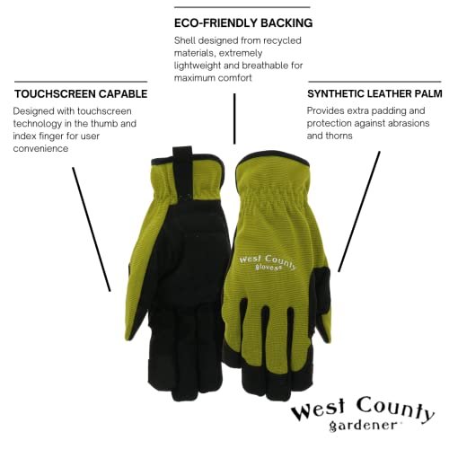 West County Gardener Eco Friendly High Dexterity Women’s Utility Glove, Touchscreen Capable, Synthetic Leather Padded Palm, Green, Large (WG52001S-WL)